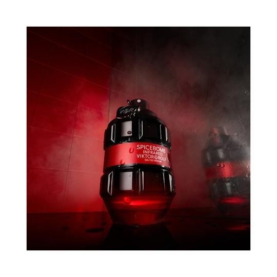 Spicebomb Infrared Eau de toilette “Inspired by infrared technology that detects body heat, VIKTOR & ROLF ignites a game of magnetic seduction that burns like a flame with SPICEBOMB INFRARED eau de toilette that increases heat in every way, creating a crescendo of sensuality, a veritable frenzy of torrid feelings and seduction, impossible to deny, unbearable to ignore, even when one is alone.The Spicebomb Infrared EDT bottle recreates the iconic Spicebomb by taking the vibrant, magnetic red of infrared light and fusing it with the black colored glass. The result is an irresistible fiery grenade, a true never-ending seduction bomb.